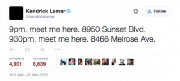 Fusing fitness and music together in a ground-breaking live event, Reebok and Kendrick Lamar put on a surprise concert where for the first time he performed tracks off of his new album To Pimp a Butterfly, which was released just a week earlier. On the 25th March Kendrick Lamar took to twitter tweeting “9pm. meet me here. 8950 Sunset Blvd.